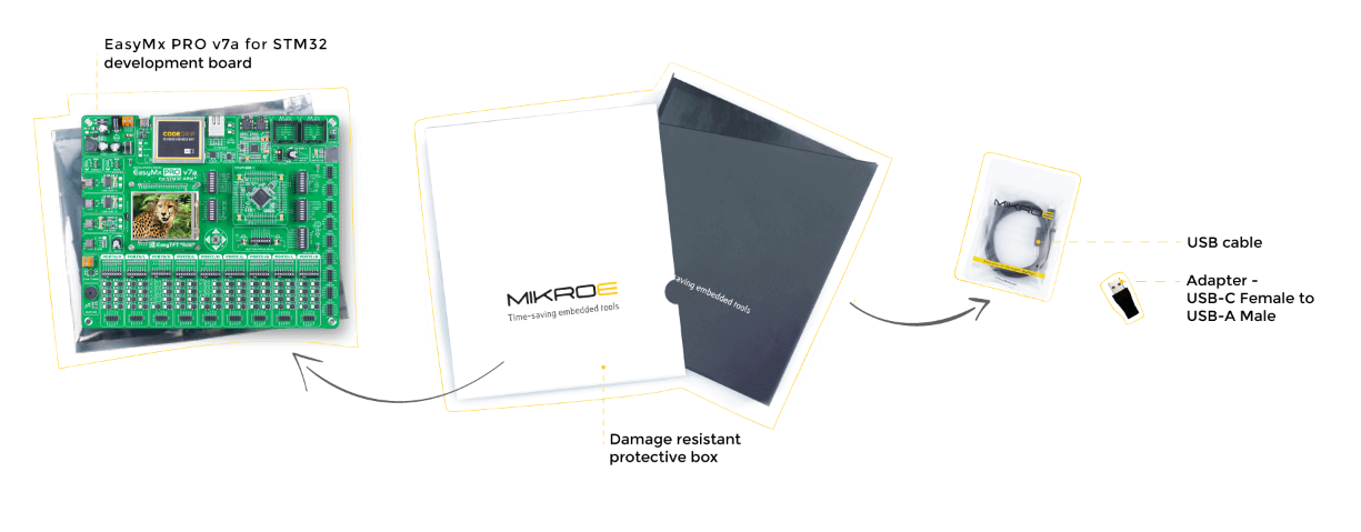 | Kutu içeriği; Easy Mx Pro v7a for STM32 Kartı, Ürün CD si, USB Kablo, Devre şeması ve kullanım kitabı |