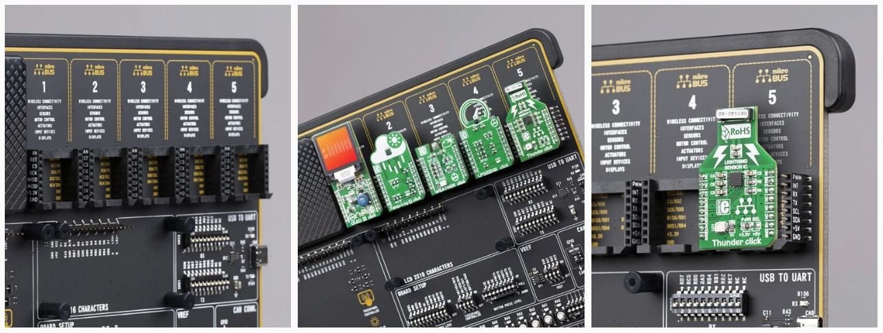 EasyPIC v8, 650'den fazla farklı Click board ™ yerleştirebileceğiniz beş adet gelişmiş mikroBUS ™ soketi sunar. Kullanılan komponentler için en iyi performansı sunmak üzere tasarlanan Click board ™ 'lar, genellikle prototip oluşturma aşamasıyla ilişkili olarak test etme ve sorun gidermeye ihtiyaç duymadan geliştiricilerin zaman kazanmasını sağlarlar. Ek olarak, dünyadaki en büyük add-on board seçimiyle sınırsız miktarda olanak sağlarlar.