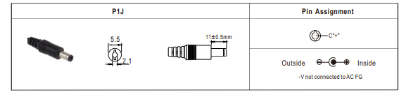 | DC Fiş (Standart) | P1J – 2.1 × 5.5 × 11 mm (merkez +) |