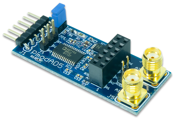 The PmodAD5 is a high resolution analog-to-digital converter built around the Analog Devices AD7193 Sigma-Delta ADC.