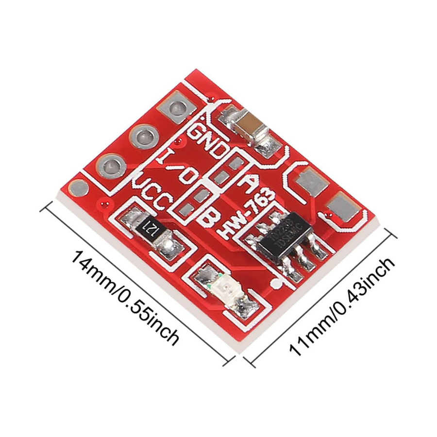 Modül üzerinde TTP223 kapasitif dokunmatik entegresi bulunur. Normal durumda çıkış seviyesi LOW (0V) iken dokunma algılandığında çıkış VCC seviyesine yükselir. 12 saniye boyunca dokunma algılanmazsa düşük güç moduna geçerek enerji tasarrufu sağlar. Dokunma algılama durumunu gösteren bir LED’e sahiptir ve metalik olmayan yüzeylerin (plastik, cam vb.) arkasından da kullanıma uygundur.
